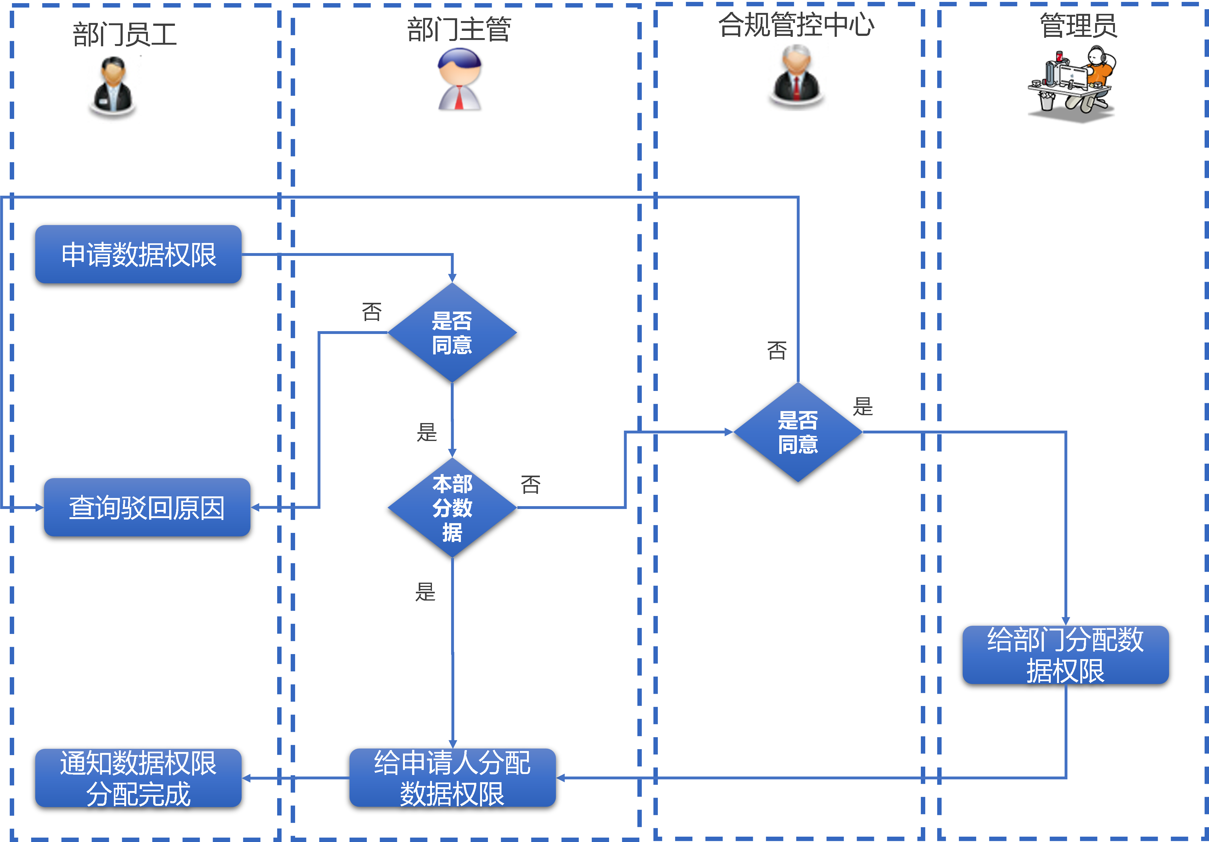 - 部门内申请:部门员工发起数据权限申请时,由部门主管直接审批并分配对应权限;