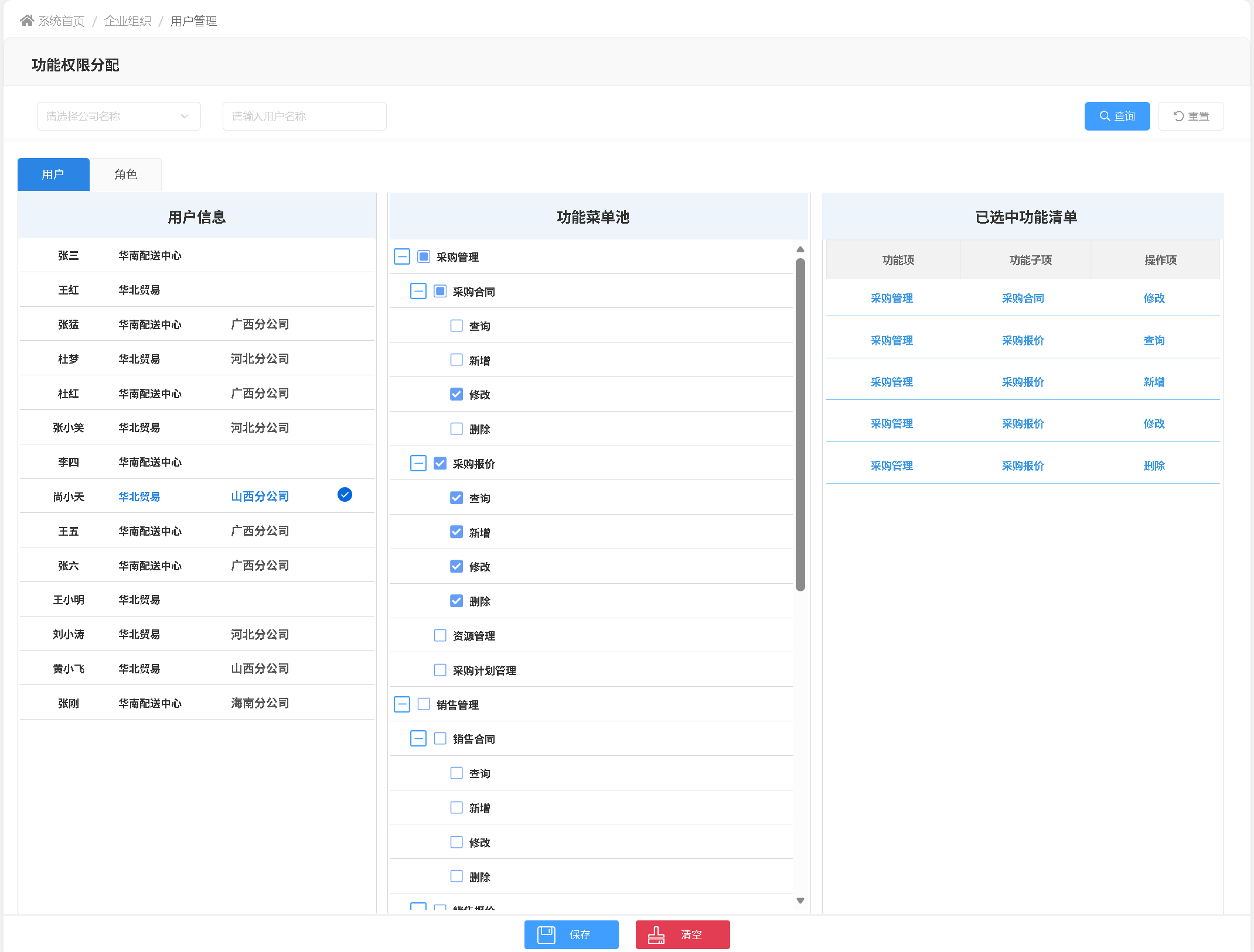 功能权限支持基于角色或用户两种维度完成分配: