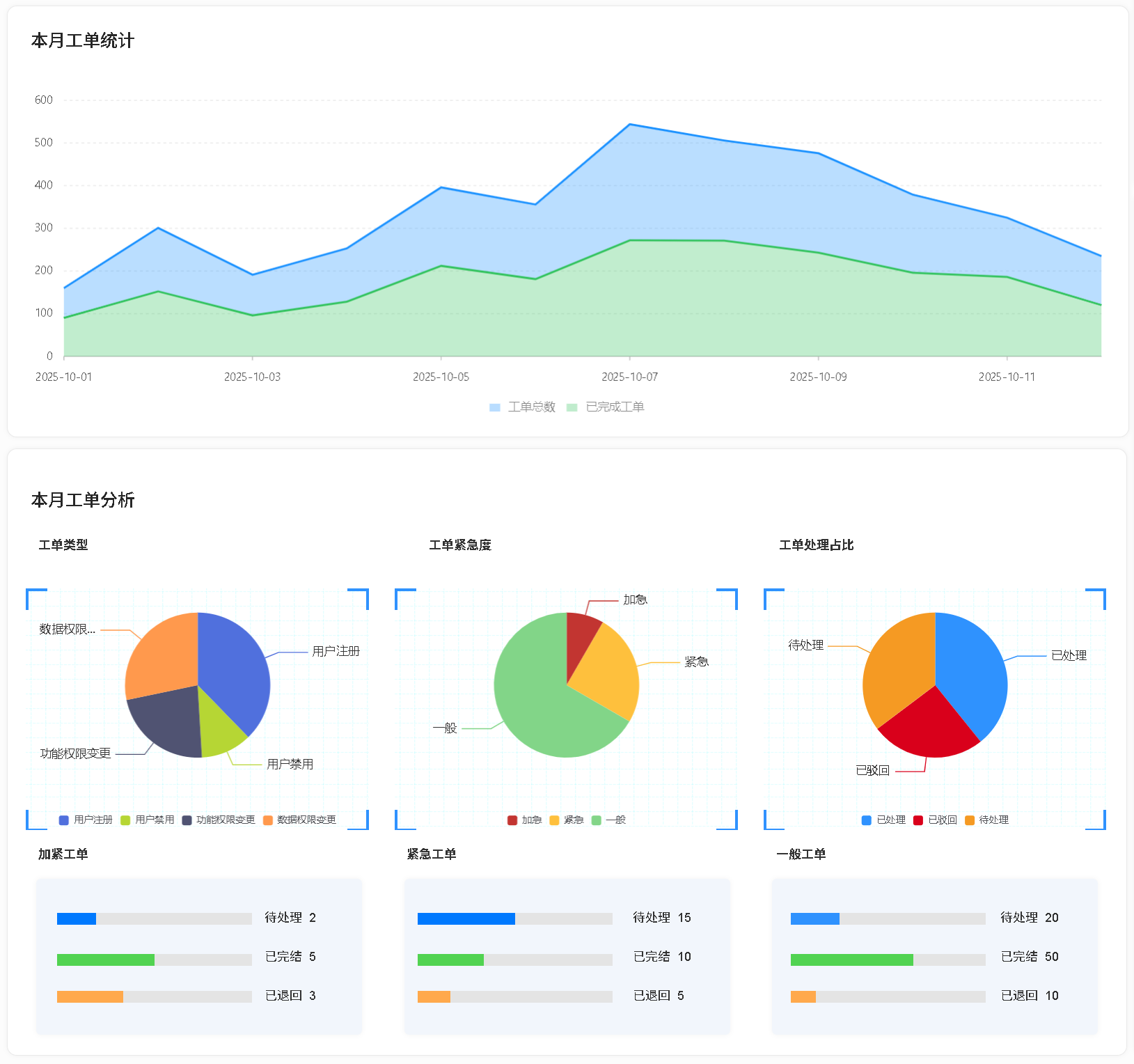 基于当前用户的工作维度,可视化呈现工单整体处理情况。通过趋势图与饼状图,支持查询指定时间范围内不同工单类型的占比分布,以及工单总量的变化趋势。