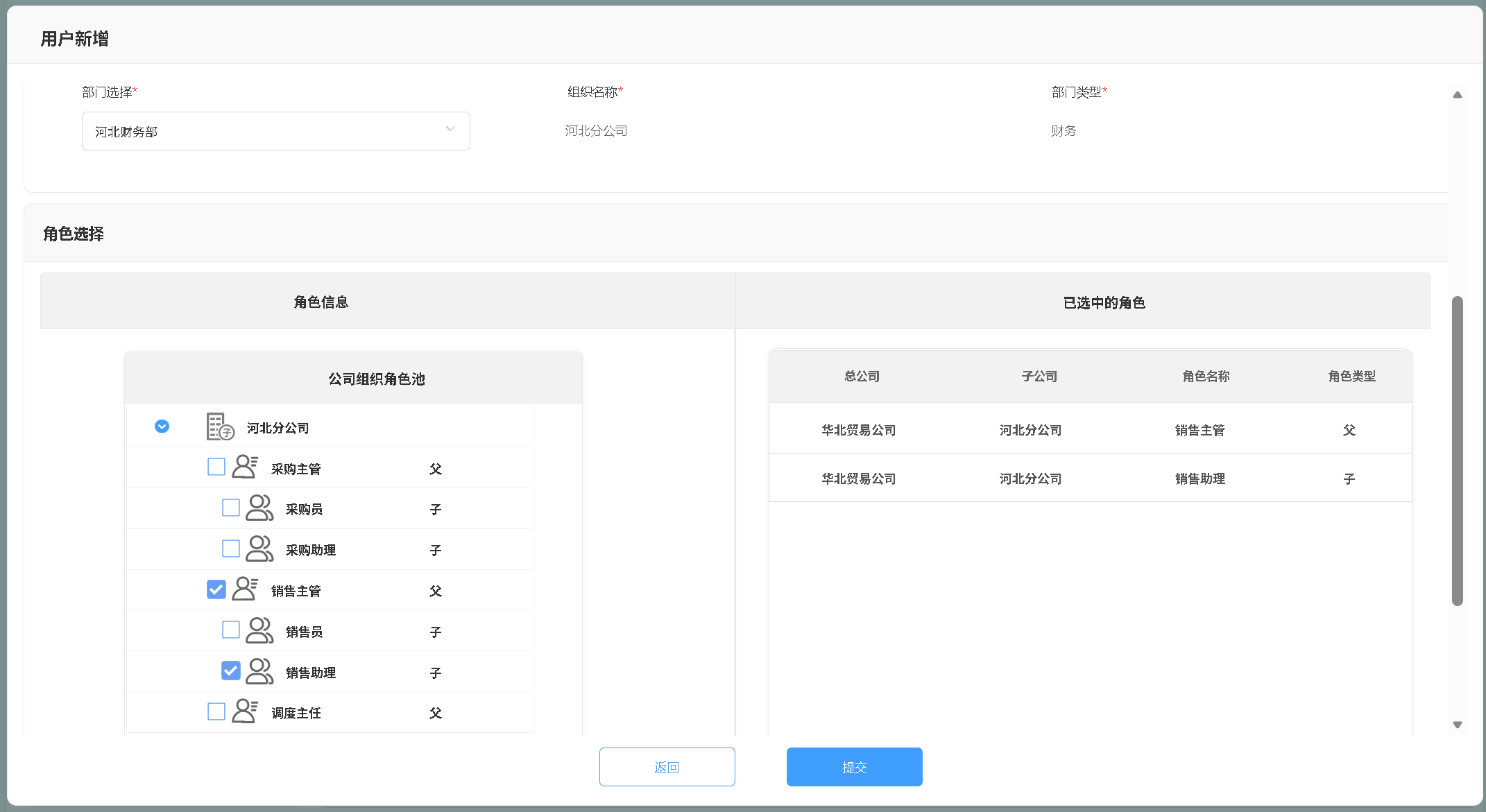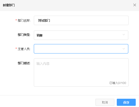 所有公司(总部/分公司)均可根据业务需求创建部门(如采购部、销售部、仓储部),并将员工按部门主管(如采购主管)和部门员工(如采购员)两类角色分配至对应部门。