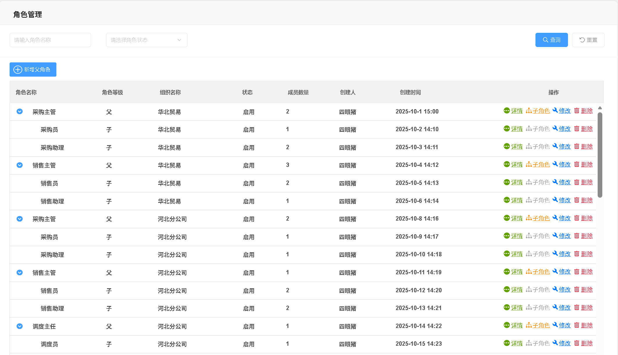系统支持父子层级的角色架构设计,核心规则为:父角色自动继承所有关联子角色的功能权限,可灵活适配企业多层级权限管控需求。