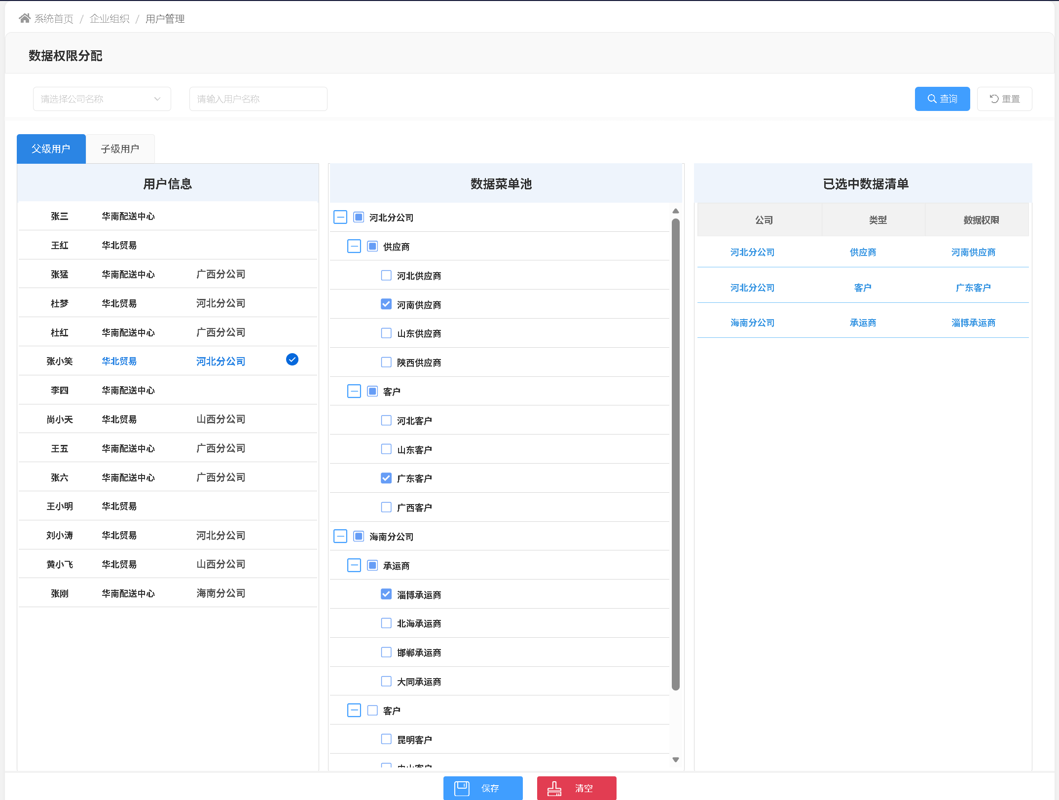 首先由管理员基于公司维度,为父角色用户分配对应范围的数据权限;获得授权的父角色用户,可将自身已分配的数据权限,向下再分配给关联子角色,适配多级组织的分层管控需求。