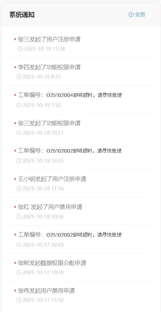 实时呈现待办消息、审批通过未处理工单及超时预警,帮助管理员快速定位优先级任务,避免延误。