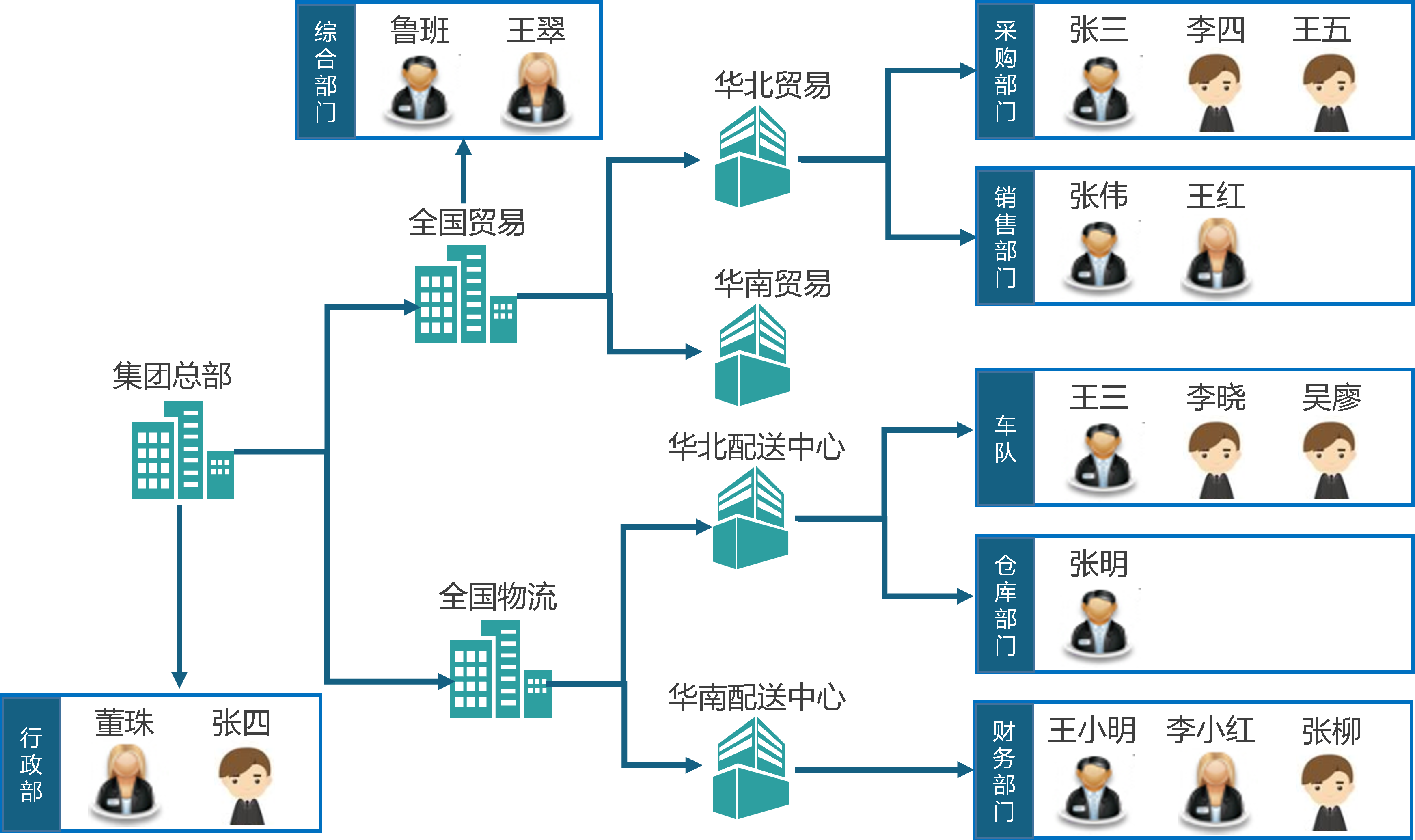 示例:华北贸易公司采购部由主管张三带领,下属员工李四、王五为采购员。
