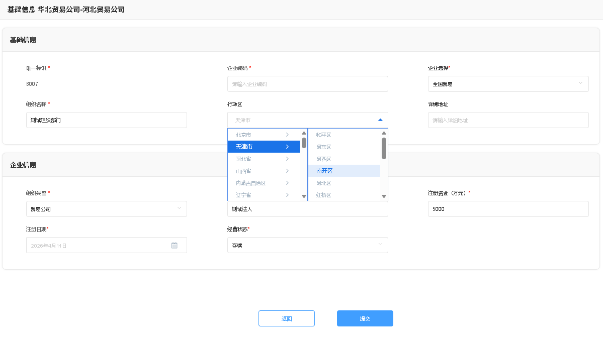 企业组织管理功能菜单主要提供公司及部门的主数据维护的能力。