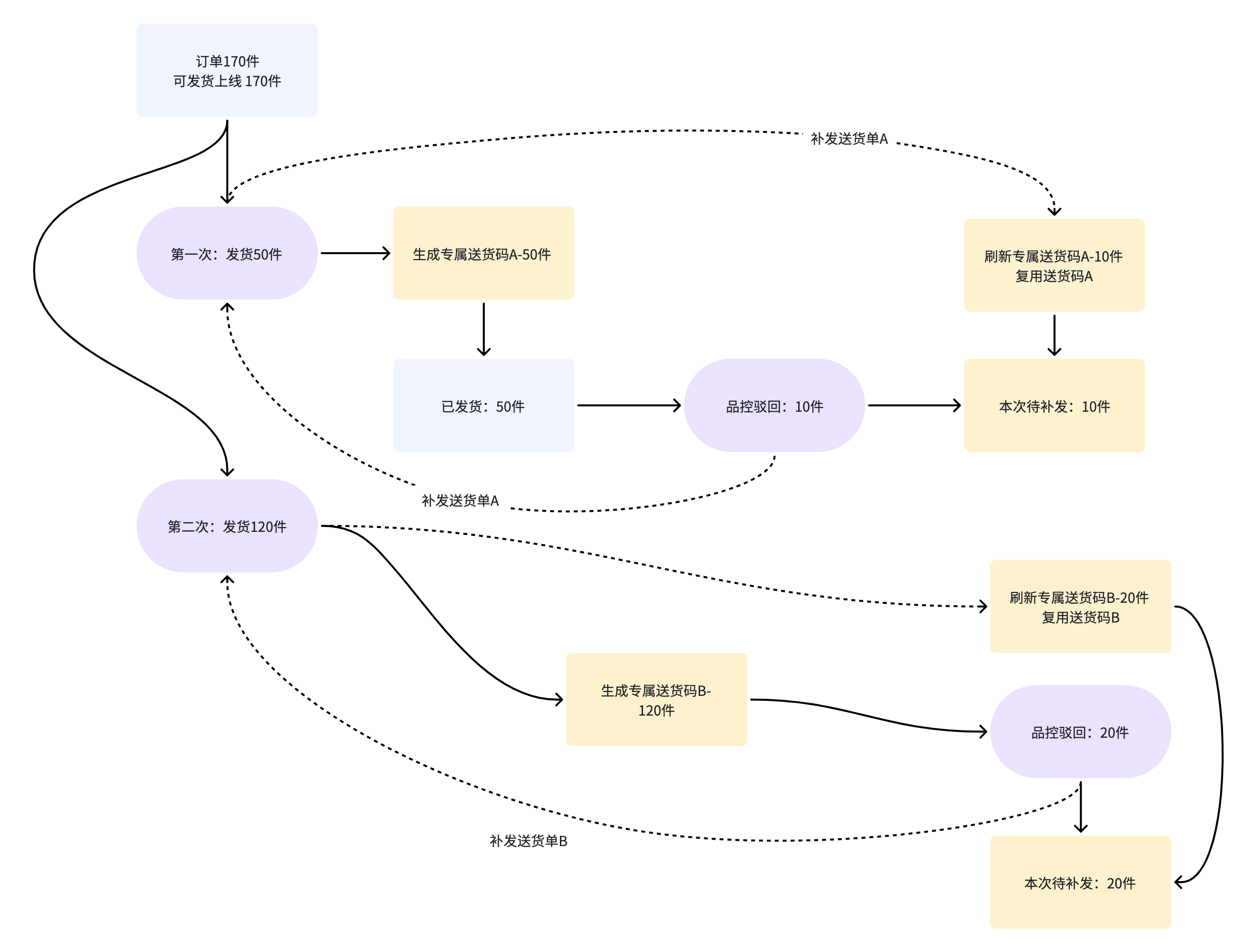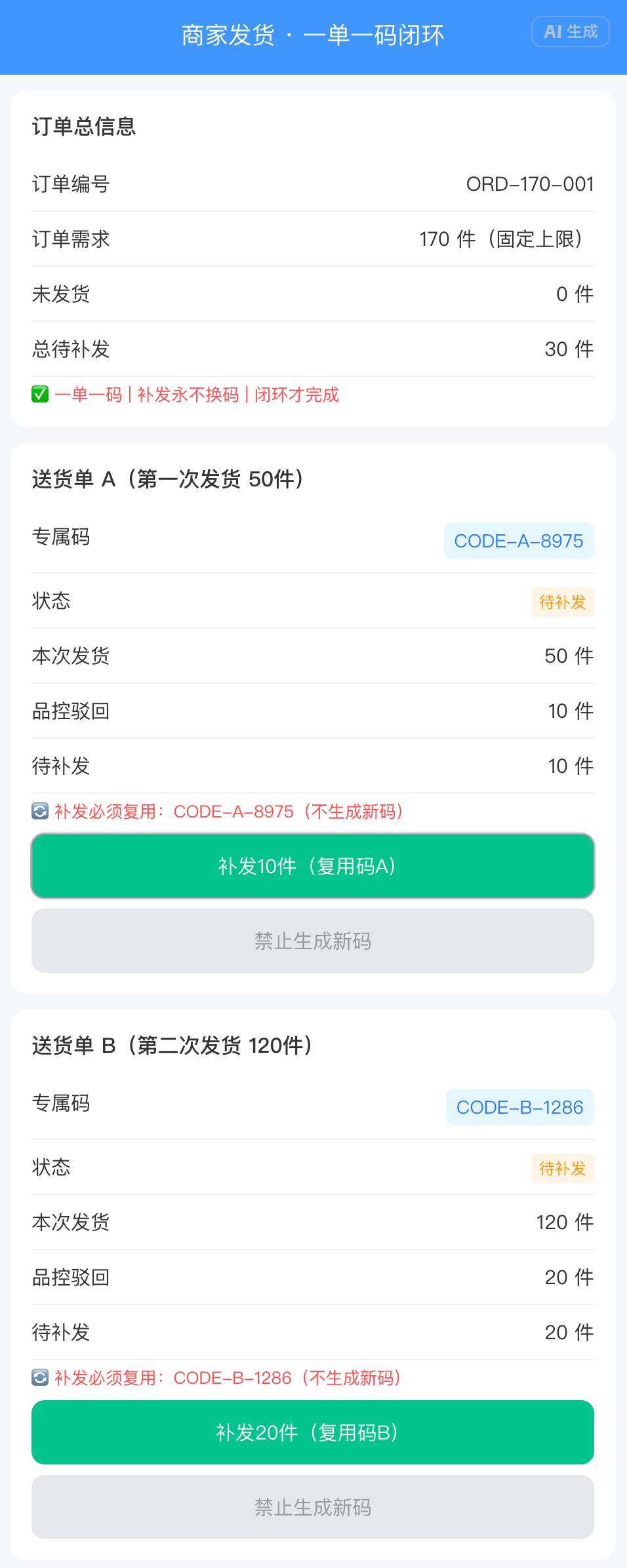 - 第二次发货120件:生成送货单B+专属码B,已发货=170件(达到上限),未发货=0件,品控驳回20件,本单待补发=20件;