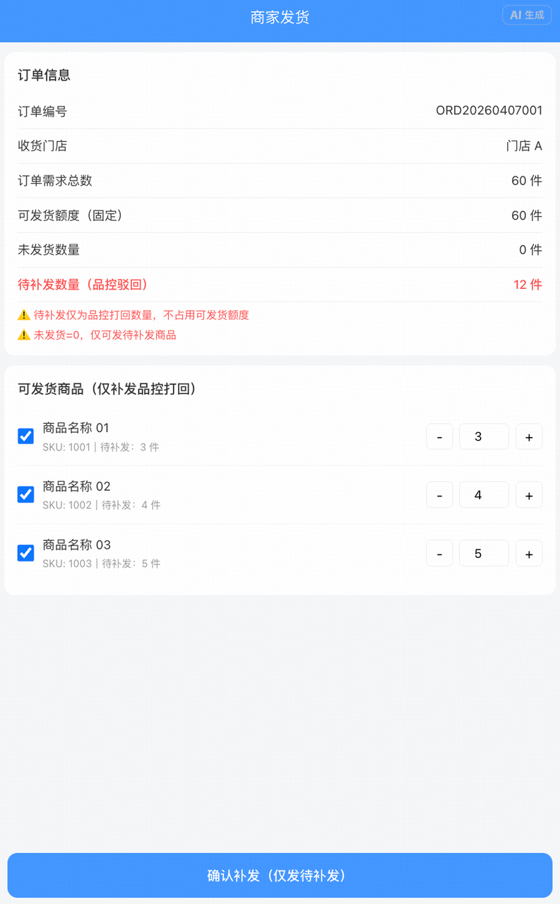 - 待补发数量严格等于品控驳回数量,与订单需求数彻底区分,杜绝商家误解;