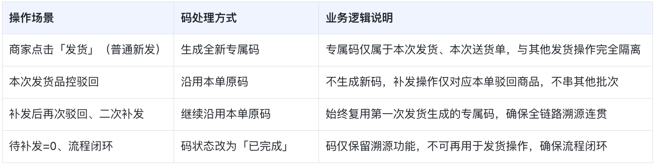 - 码的生命周期:本次发货生成→仓库品控验收→不合格驳回后补发→待补发数量清零→流程闭环,全程不生成新码,确保溯源连贯。