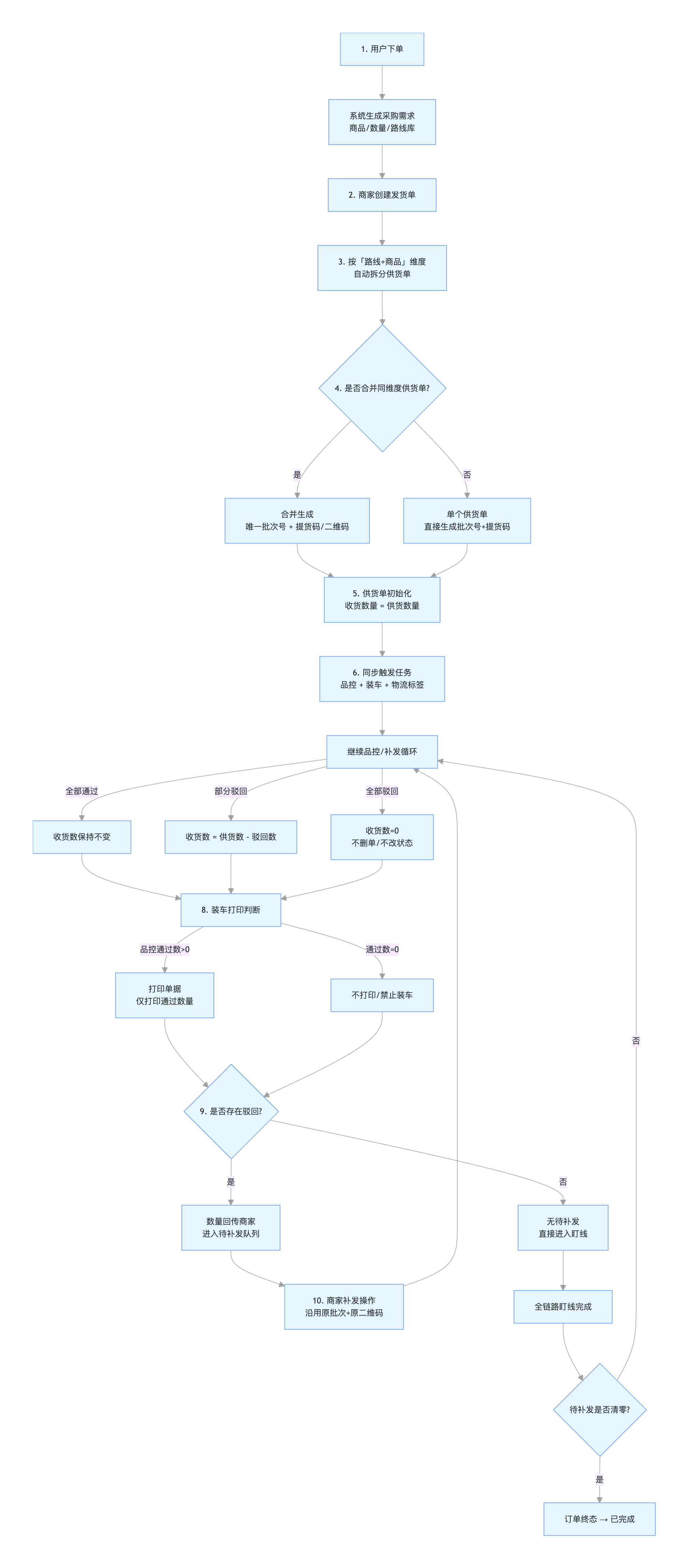 - 商家根据采购需求创建发货单,系统按「路线+商品」维度自动拆分生成供货单;