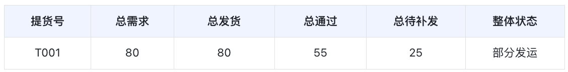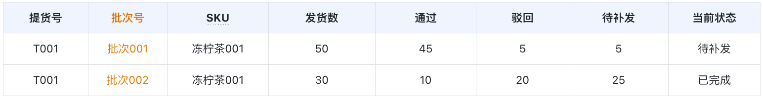 - 原批次001发货100件,品控驳回20件,待补发=20件;