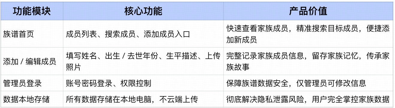 - 产品空白:市面上的族谱工具要么功能复杂、门槛高,要么商业化严重,缺乏一款「轻量化、易上手、可本地部署、隐私安全」的个人 / 家庭级族谱工具;