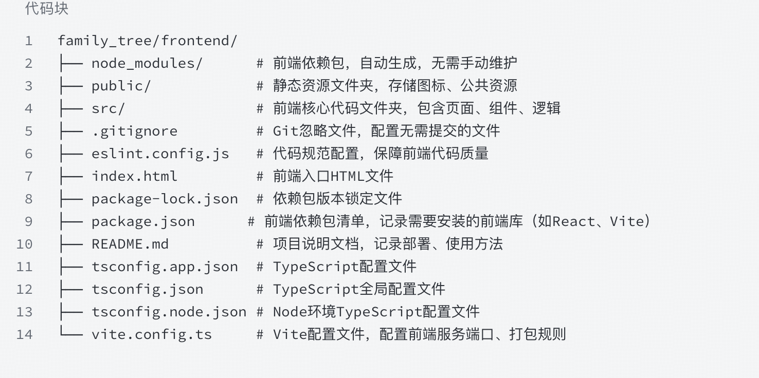 前端目录围绕「用户交互 + 页面展示」设计,src是核心,包含所有页面、组件,确保产品界面的交互体验;package.json定义前端依赖,确保项目可一键安装、启动。
