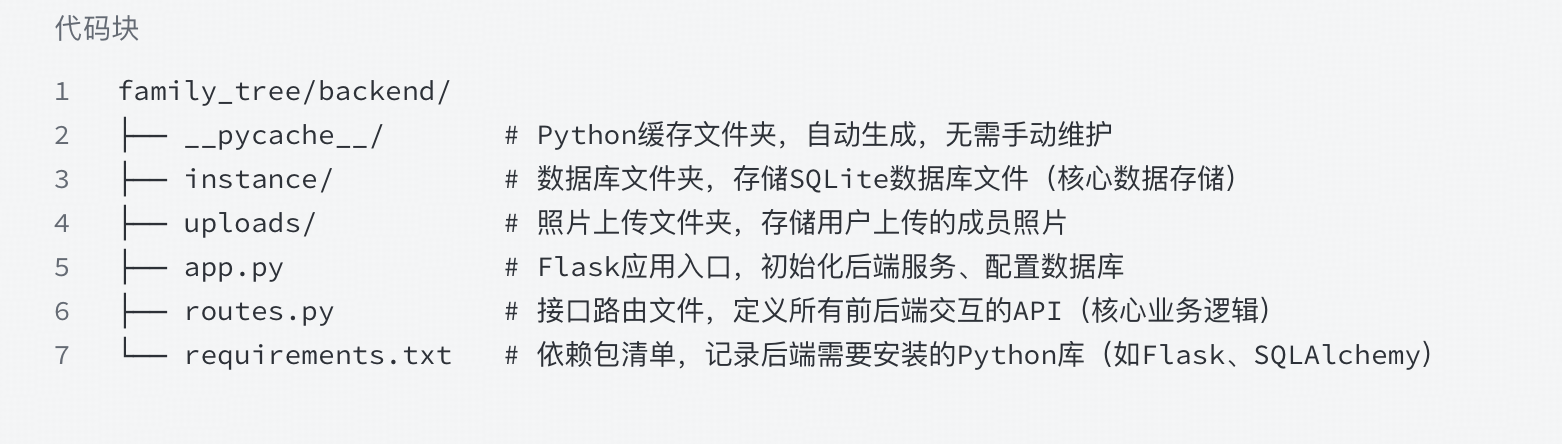 后端目录完全围绕「业务逻辑 + 数据存储」设计,routes.py是核心,所有产品功能(添加成员、上传照片、登录)都对应这里的 API 接口;instance存储核心族谱数据,uploads存储照片,确保数据安全。