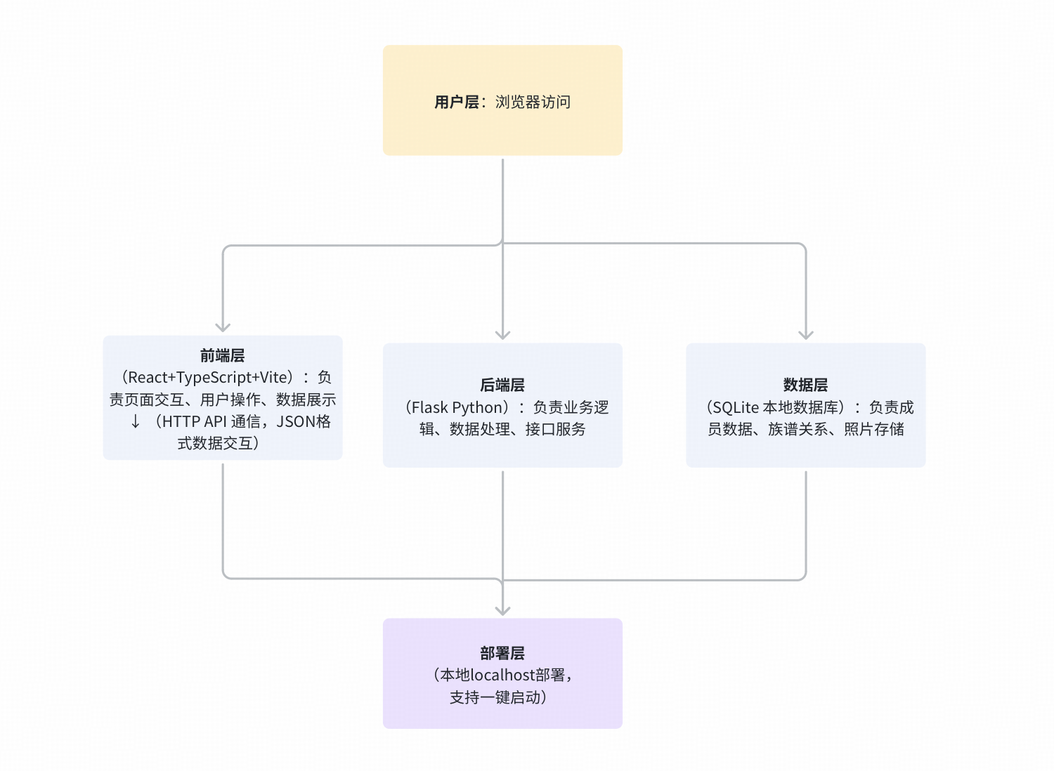 - 可扩展性:架构支持后续迭代,可新增族谱可视化、亲属关系管理、导出 PDF 等功能。