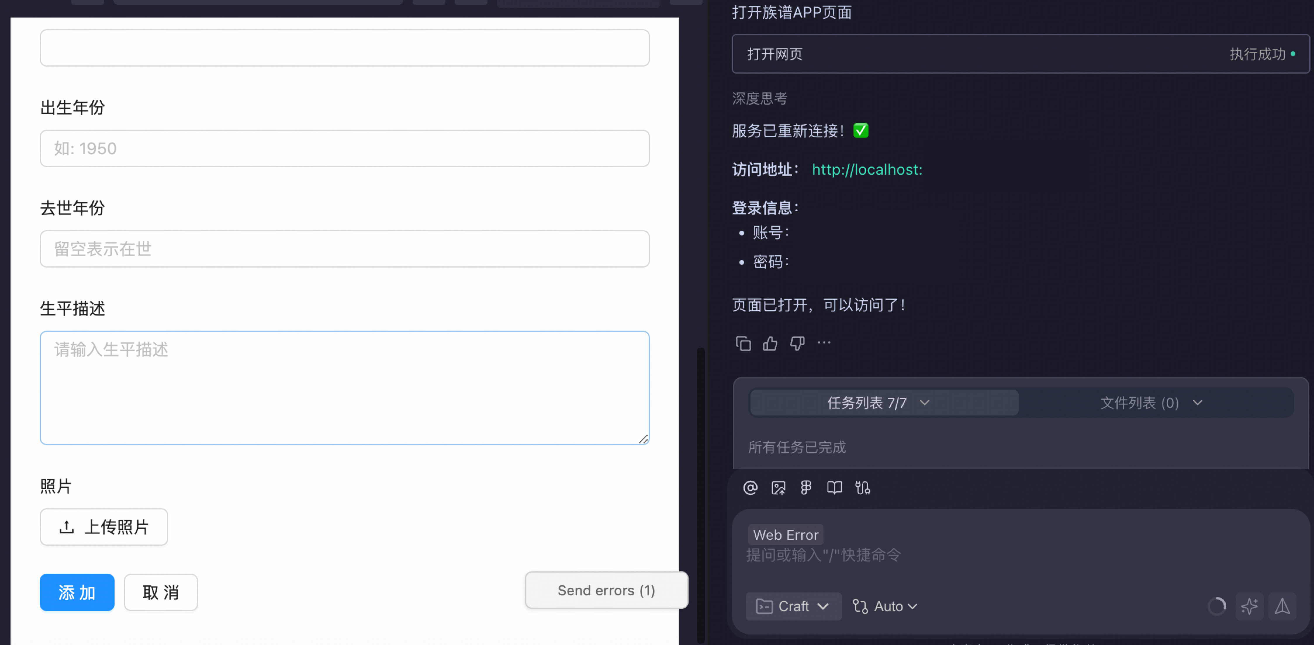 修复 AI 生成代码中的 BUG,优化交互细节,完成前后端联调,最终实现可本地部署、可正常使用的族谱 APP。