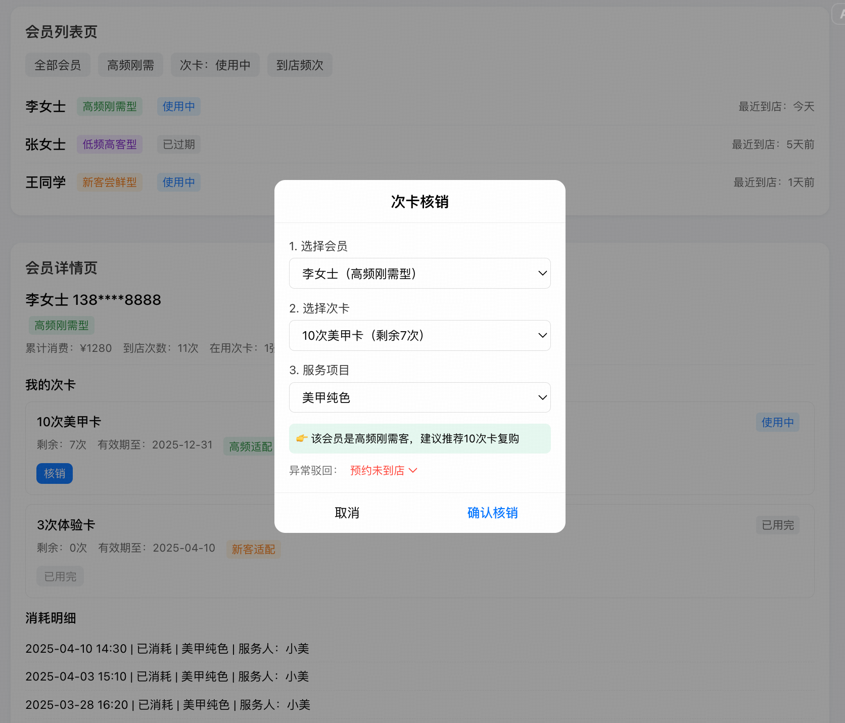 - 3步极简核销:选择会员→选次卡→确认核销,≤1分钟完成,对应US-03、US-09,兼顾商家效率与会员体验;