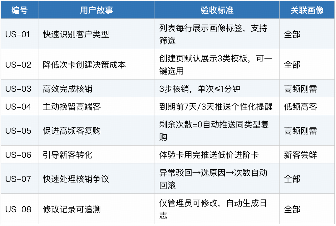 用户故事是产品设计的灵魂,本次迭代全程以商家与会员的真实诉求为导向,梳理出两类核心用户故事,覆盖核销、次卡管理、会员触达、异常处理等全场景,每一条用户故事都对应明确的验收标准,确保功能落地后能真正解决问题,而非单纯的功能堆砌。