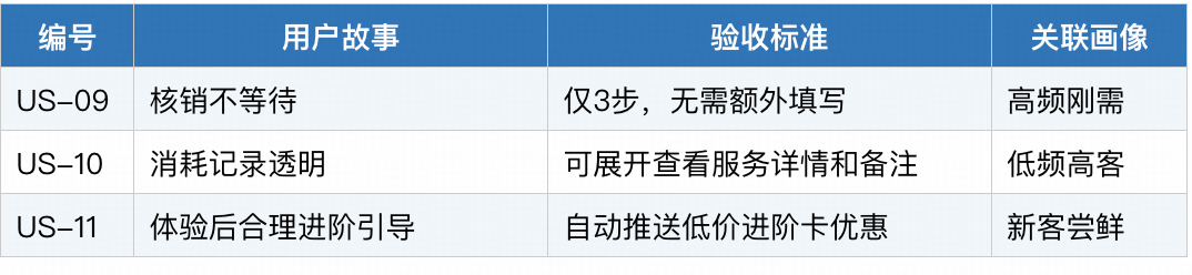 US-03:高效完成核销,不耽误服务客户——高频刚需客核销频繁,商家希望核销流程简单、快速,避免让客户等待。验收标准:3步完成核销(选择会员→选次卡→确认核销),单次核销耗时≤1分钟,无需额外填写信息,契合当下美业核销“快速、简洁”的行业现状。