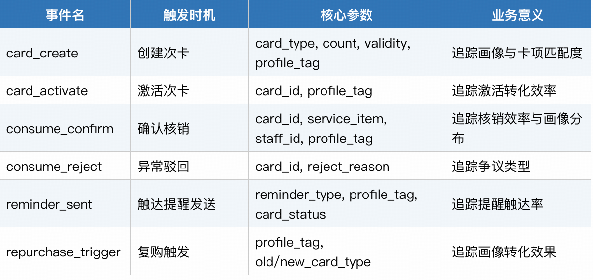 - card_create(次卡创建):触发时机为商家创建次卡,核心参数包括卡项类型、次数、有效期、适配画像标签,用于追踪画像与卡项的匹配度;
