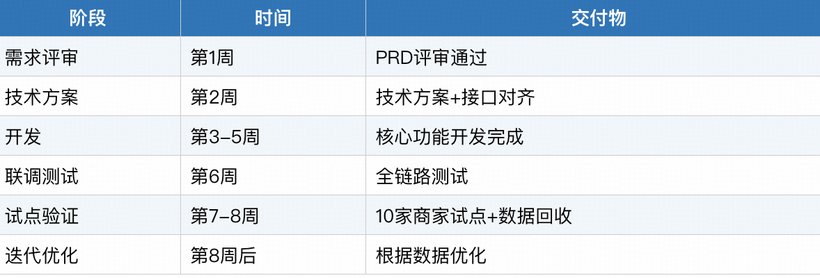第8周后(迭代优化):根据试点数据与商家反馈,优化功能体验、迭代算法模型,完善产品。