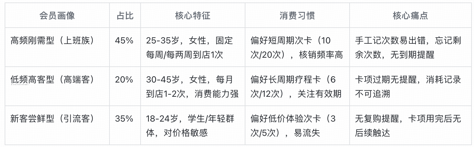 任何产品的启动,都应源于真实的用户痛点。在项目初期,我们通过商家后台数据梳理,结合30+中小美业门店的线下访谈,不仅发现了现有体系与美业场景的脱节、不同会员群体需求差异被忽视的核心矛盾,更意识到传统运营逻辑的落后——仅靠过期前发短信的单一触达方式,早已无法满足当下会员的留存需求,也难以解决商家的实际运营难题。