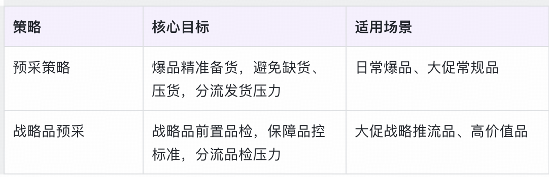 - 预采策略2.0:解决爆品提前备货,分流发货压力,保障爆品不缺货;