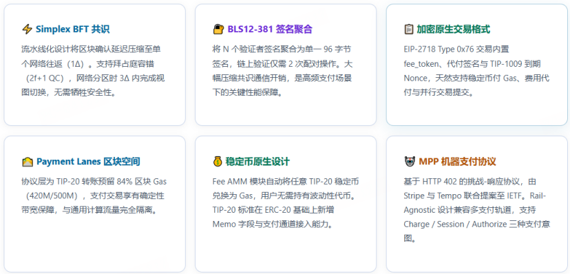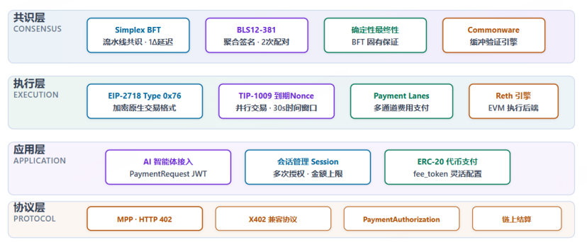 作为Commonware 推出的支付原生区块链,Tempo 以 Simplex BFT 流水线共识实现亚秒级最终性,以专用区块空间和稳定币原生 Gas 机制保障支付优先级,并通过 MPP 协议为 AI 智能体提供端到端的无人工干预支付能力。