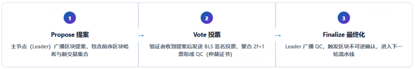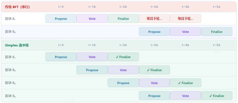 性能提升关键:在流水线模式下,B₂ 的 Propose 阶段与 B₁ 的 Vote 阶段重叠进行。每一轮仅需等待1Δ即可进入下一区块的提案,而传统 BFT 每轮需要完整的3Δ串行等待。