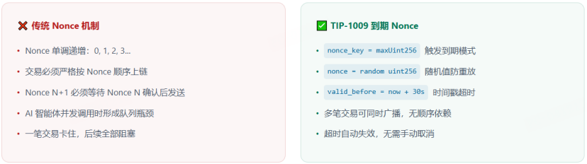 传统EVM的严格递增Nonce强制同一账户所有交易串行执行。Tempo将Nonce改为”有效区块范围”,仅要求Nonce在有效期内唯一,同一账户多笔相互独立的交易可同时提交并并发执行,消除账户级串行瓶颈。