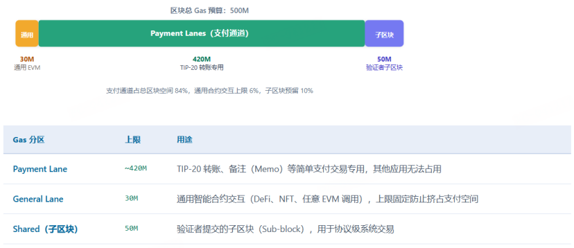 ayment Lanes 是 Tempo 在协议层面为 TIP-20 支付交易专项预留的区块空间。与以太坊将所有交易竞争同一 gas 池不同,Tempo 将区块 gas 预算拆分为多个独立通道,使支付交易不受 DeFi 操作、NFT 铸造或高频合约调用的”嘈杂邻居”干扰。