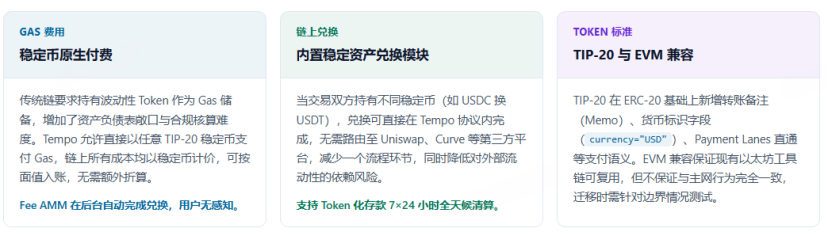 Tempo 将稳定币作为协议一等公民,从 Gas 费用、链上兑换到 Token 标准,全链路以稳定币为核心重新设计