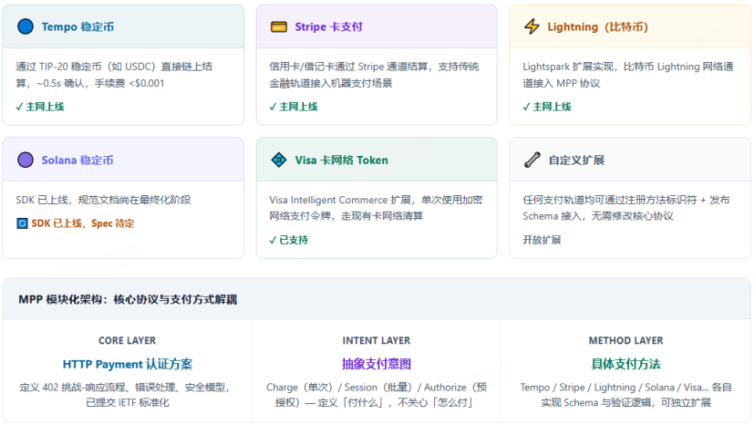 MPP 的核心设计是将协议与支付轨道彻底解耦。核心层只定义 HTTP 挑战-响应流程、错误处理和安全模型,不绑定任何具体支付网络。因此,新增支付方式只需注册方法标识符,并发布对应的 Schema 与验证逻辑,无需改动协议本身。支付时,智能体无需关心底层轨道,由服务端在 402 响应中声明可接受的方式,客户端再按需匹配。这正是 MPP 区别于单一链或单一网络方案的关键。