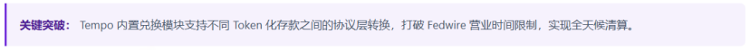但区块链可以天然支持 7×24 小时、全年无休运行,而且 Tempo 的内置兑换模块还能够支持不同 Token 化存款之间的协议层转换,这将使全天候清算成为可能。