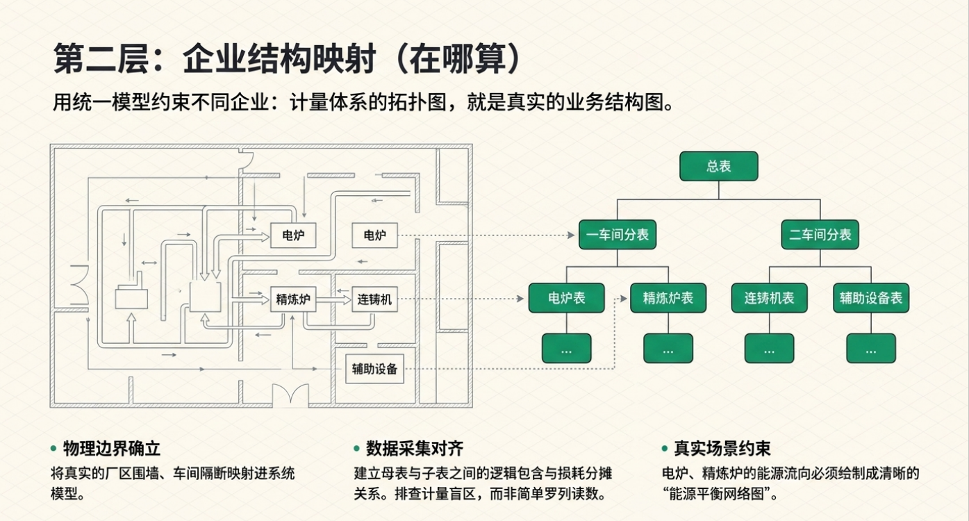 场景举例分析:钢企的能源平衡网络在钢铁企业中,真正的管理模型从来不是软件界面上的各类柱状图和饼图,而是底层的计量网络架构。电炉、精炼炉、连铸机的能源流向必须被清晰地绘制成一张“能源平衡网络图”。系统需要定义清楚:一级总表、二级车间表、三级工序/设备表之间的拓扑关系。如果系统仅仅是把各级电表的读数“罗列”在页面上,而没有在底层结构中建立母表与子表之间的逻辑包含与损耗分摊关系,那么这个系统连最基本的“计量盲区排查”都做不到,更遑论指导生产调度。计量体系的拓扑图,就是真实的业务结构图;软件,仅仅是这层结构的展示UI。