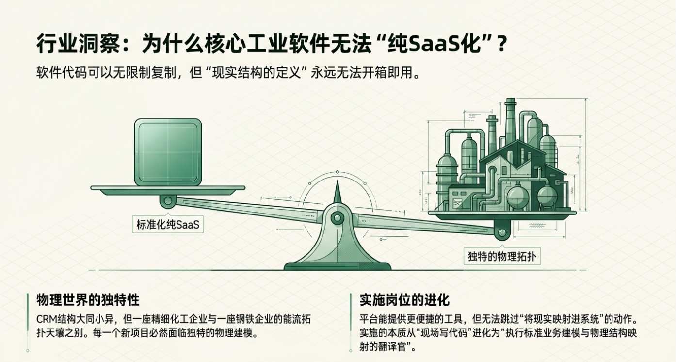 理解了前两层方法论,我们就能用一种更底层的视角,去解释工业数字化领域长期存在的一个现象:为什么标准化的软件产品依然需要极重的现场实施?为什么在HR、CRM领域大杀四方的纯SaaS模式,在核心工业生产管控领域始终“轻不下来”?