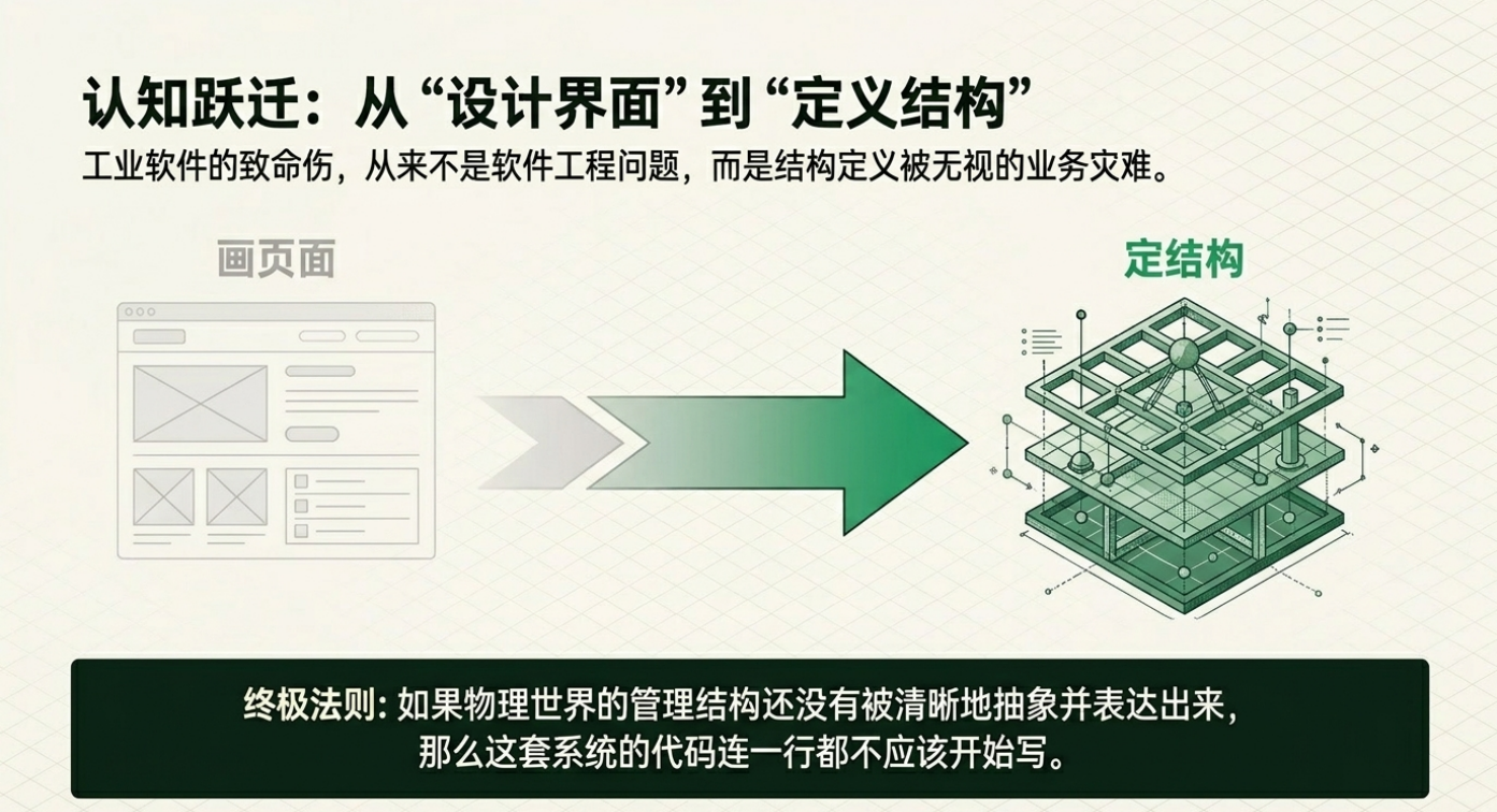 最终,这一切可以收敛为一句话:工业软件的致命伤,从来都不是软件工程问题,而是“结构定义被无视的业务灾难”。你从来都不是在设计一个软件功能,你是在定义一套业务结构。系统,仅仅是你定义结果的最终表达形式。