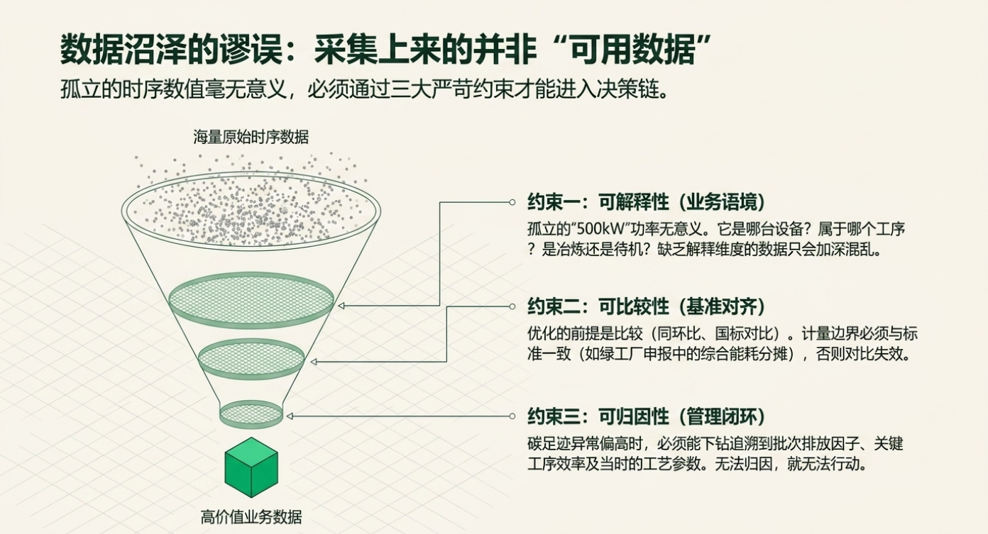 工业场景中,一组数据要洗去“原始的铅华”,真正具备业务管理价值,必须满足三个极其严苛的约束:可解释性、可比较性、可归因性。缺失任何一项,数据都无法顺利进入企业的决策链条。