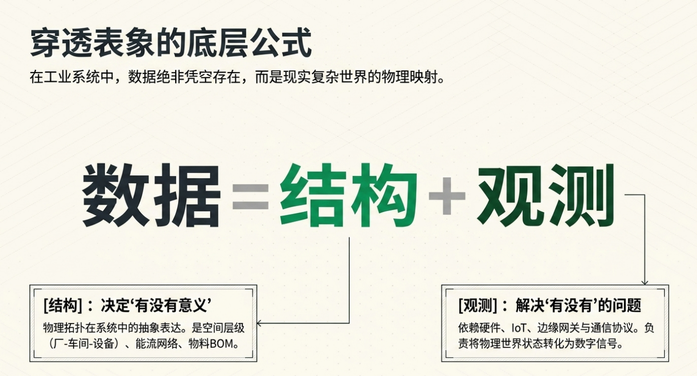 在工业场景中,我们必须建立一个清醒的认知:工业系统中的数据绝对不是独立、凭空存在的,而是来源于现实复杂世界的物理映射。为了彻底看清数据不可用的病灶,我们需要提出一个更准确的底层公式:数据=结构+观测
