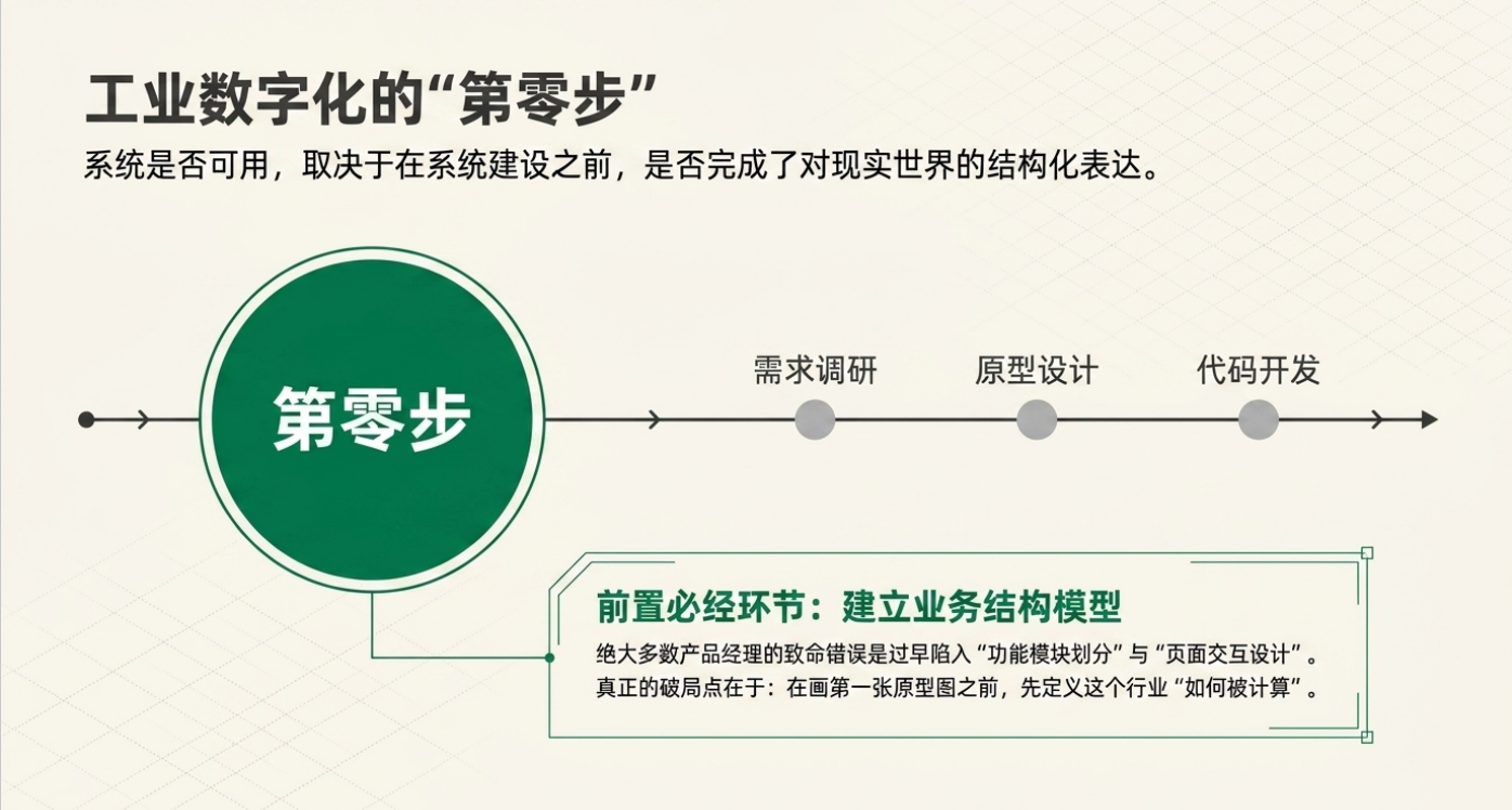 工业软件开发或实施团队往往急于进入需求调研、原型设计、代码开发的流程,却忽略了在这之前必须存在的“第零步”——建立业务的结构模型。没有这个前置步骤,后续所有的工作都是在错误的轨道上加速前行。