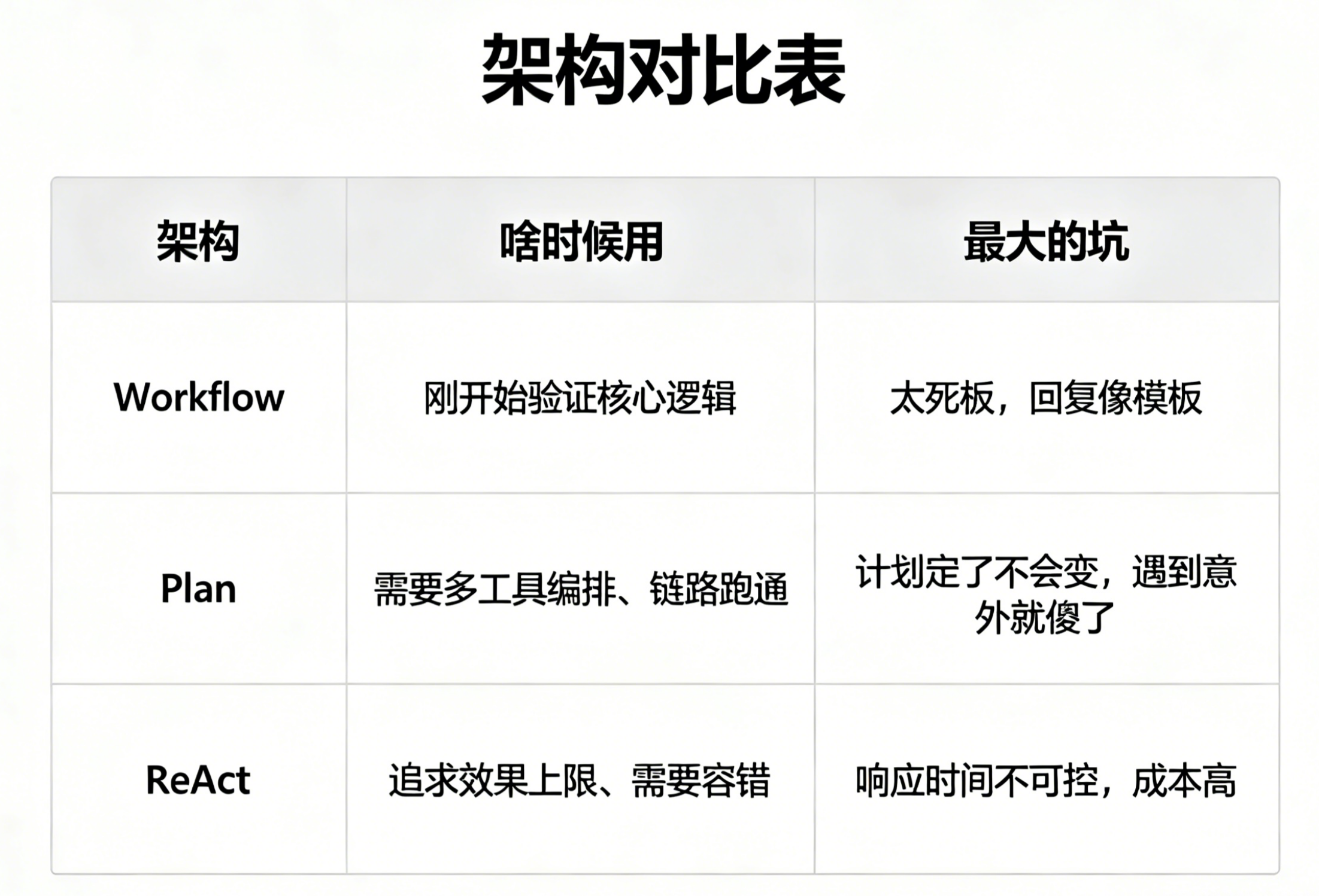 我们每次换架构都是被具体问题逼的,不是为了”技术升级”而升级。先用最简单的方案跑起来,真出问题了再换,比一上来就追求ReAct靠谱得多。