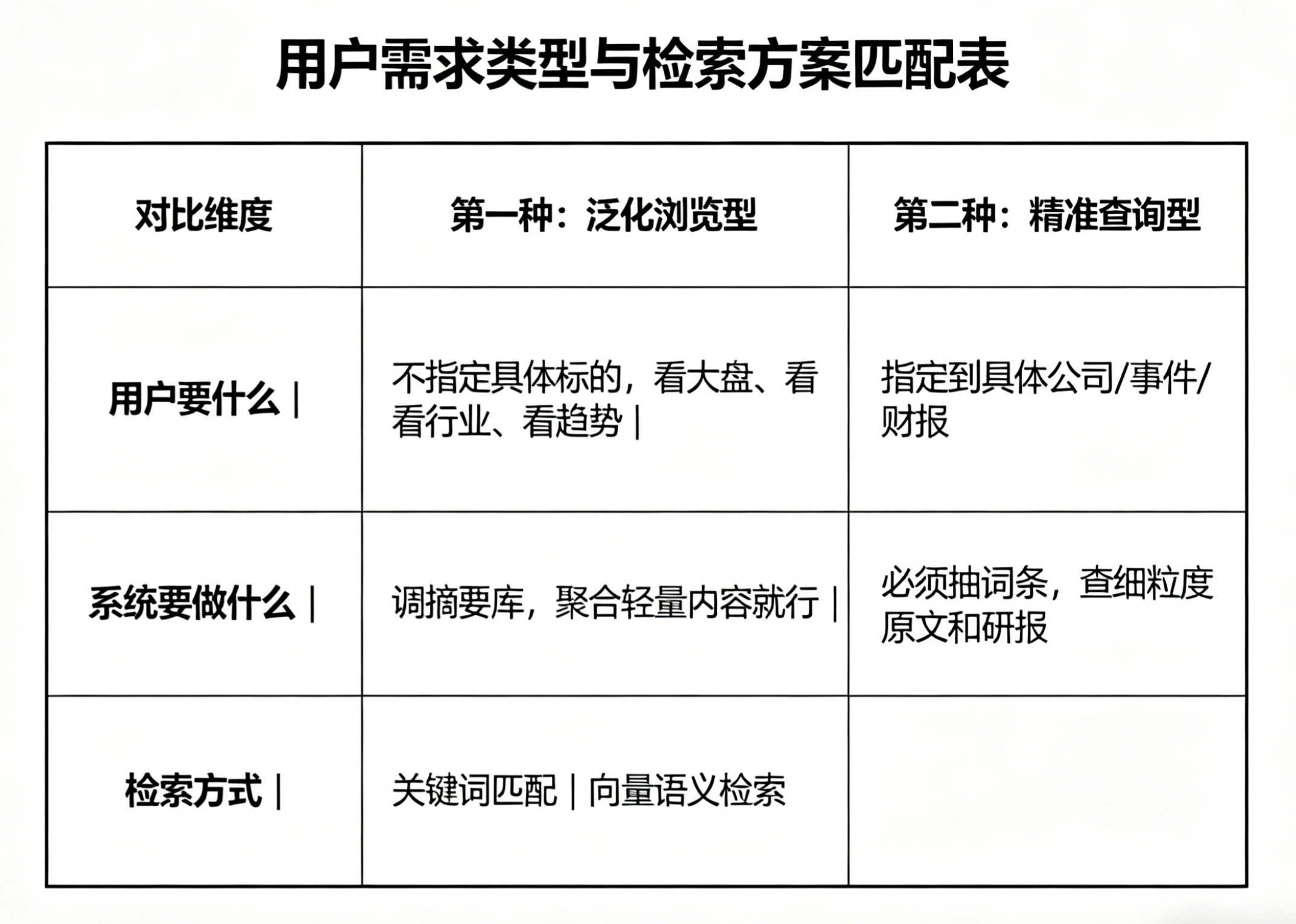 你想想散户平时怎么获取投研信息?要么自己硬啃研报(大部分人看不懂),要么用第三方AI炒股软件(质量参差不齐)。我们的优势是券商自己有事件库、研报库、行情数据这些”弹药”,但一直没有好的方式递到散户手里。所以这个项目的目标就是:用多智能体架构,把专业数据翻译成散户看得懂的人话。