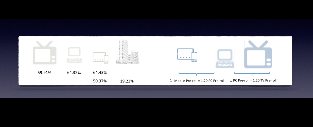 我们对比了电视、PC、pad 、手机和户外楼宇。大家都会认为户外广告是个挺贵的屏幕,但实际上在人们上班的路上,真正能看到的机率连 20% 都不到。你们的公司在投户外广告时实际有多大价值?连最基本的被看到都没有,且不要说被记住,或者被喜爱了。