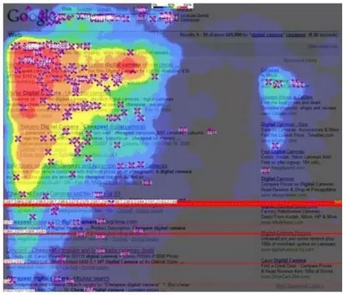 在谷歌搜索页面,前五个搜索结果获得的“眼球”最多。红线代表你必须滚动鼠标翻页了。