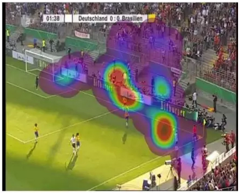 足球比赛,观众看得不只是正在踢球的运动员,还有他对面的观众席区域。