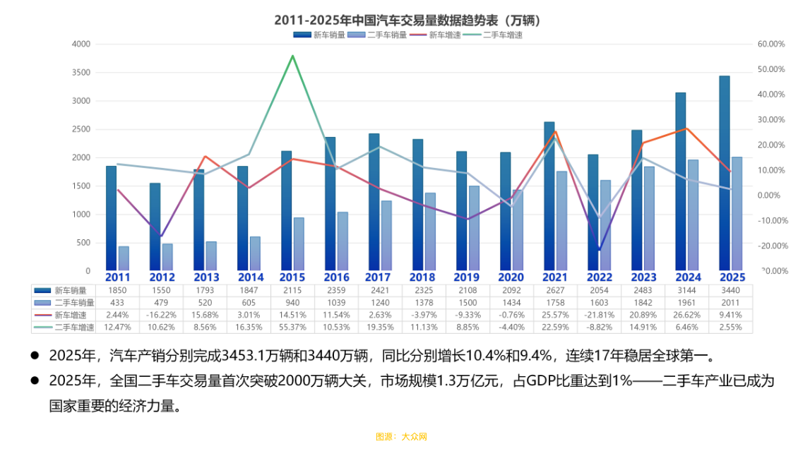 市场大盘持续扩容。 根据中国汽车流通协会最新发布的数据,2025年全国二手车累计交易量首次突破2000万辆大关,达到2010.80万辆,同比增长2.52%;累计交易金额达12897.90亿元(约1.3万亿元),创历史新高。这一量级的市场基础,为二手车金融服务的渗透提供了广阔的土壤。自2016年二手车交易量首次突破千万辆以来,历经十年发展,市场实现了从千万辆到两千万辆的量级跨越,彰显出强劲的发展韧性。