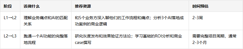 - 一定要有实战项目。 在现有工作中找机会引入AI——哪怕只是用AI做竞品分析、用AI辅助写需求文档,都比看100篇文章有用。