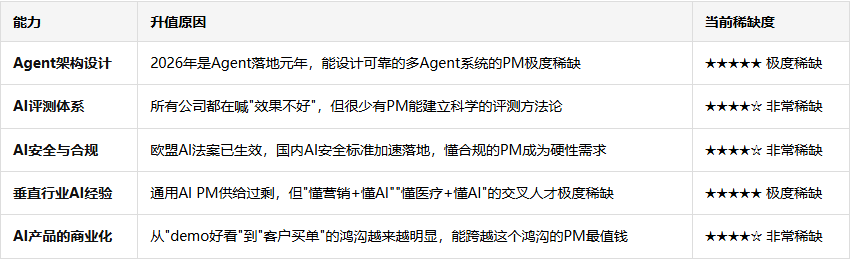 - 关注AI Safety和合规。 2026年全球AI监管在加速落地,懂安全合规的AI PM会成为稀缺资源。这不是技术问题,是商业战略问题。