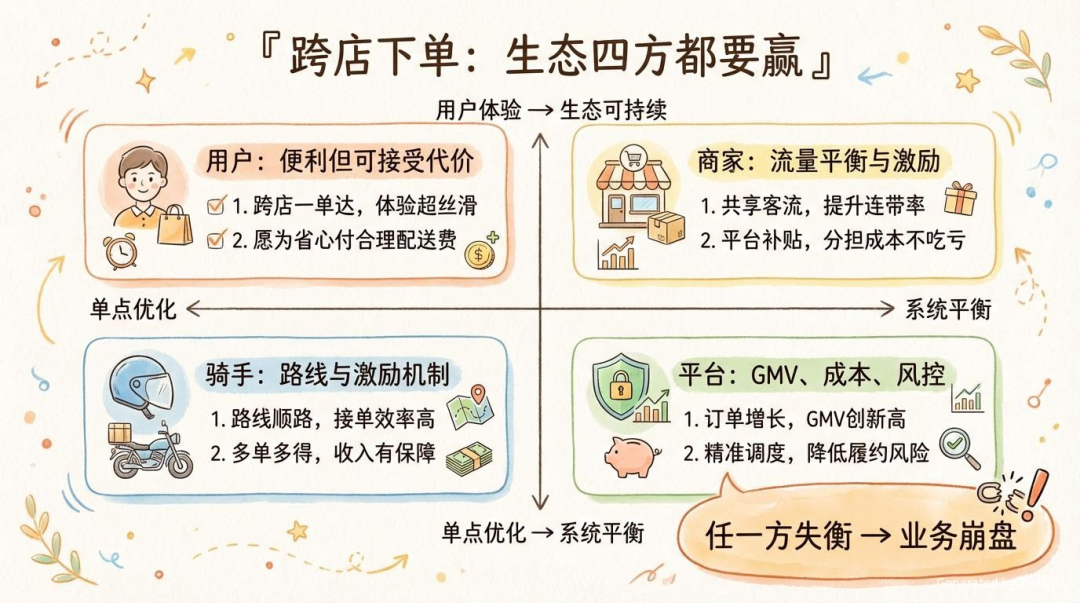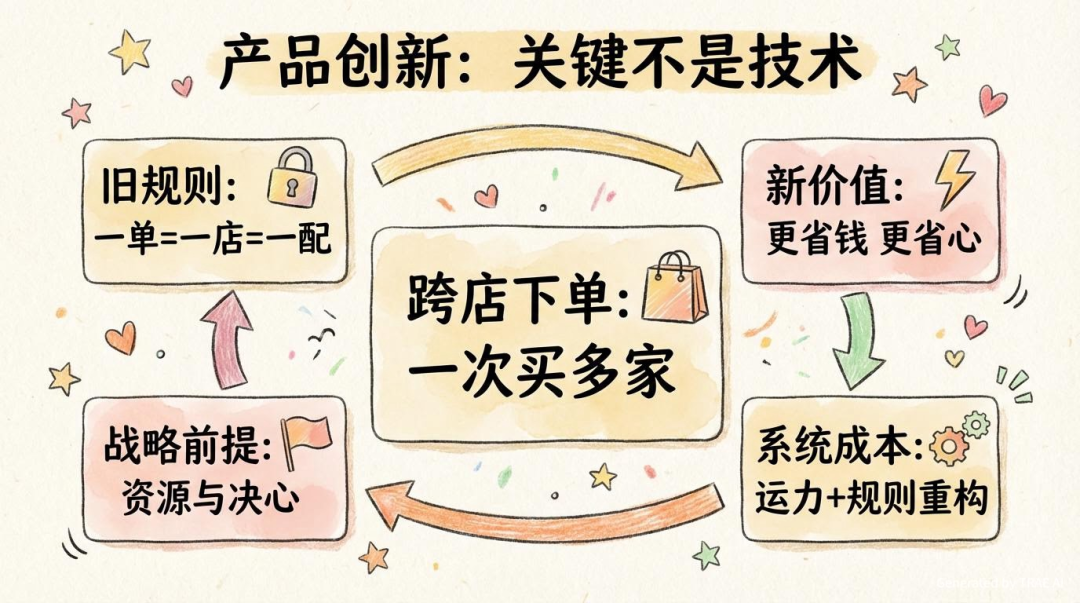 回到开头那个“跨店下单”的例子。当一个 PM 开始思考“为什么不能一笔订单下多家店”时,他触及的就是对即时零售“交易单元”的重新定义。这是一个典型的战略级问题,因为它: