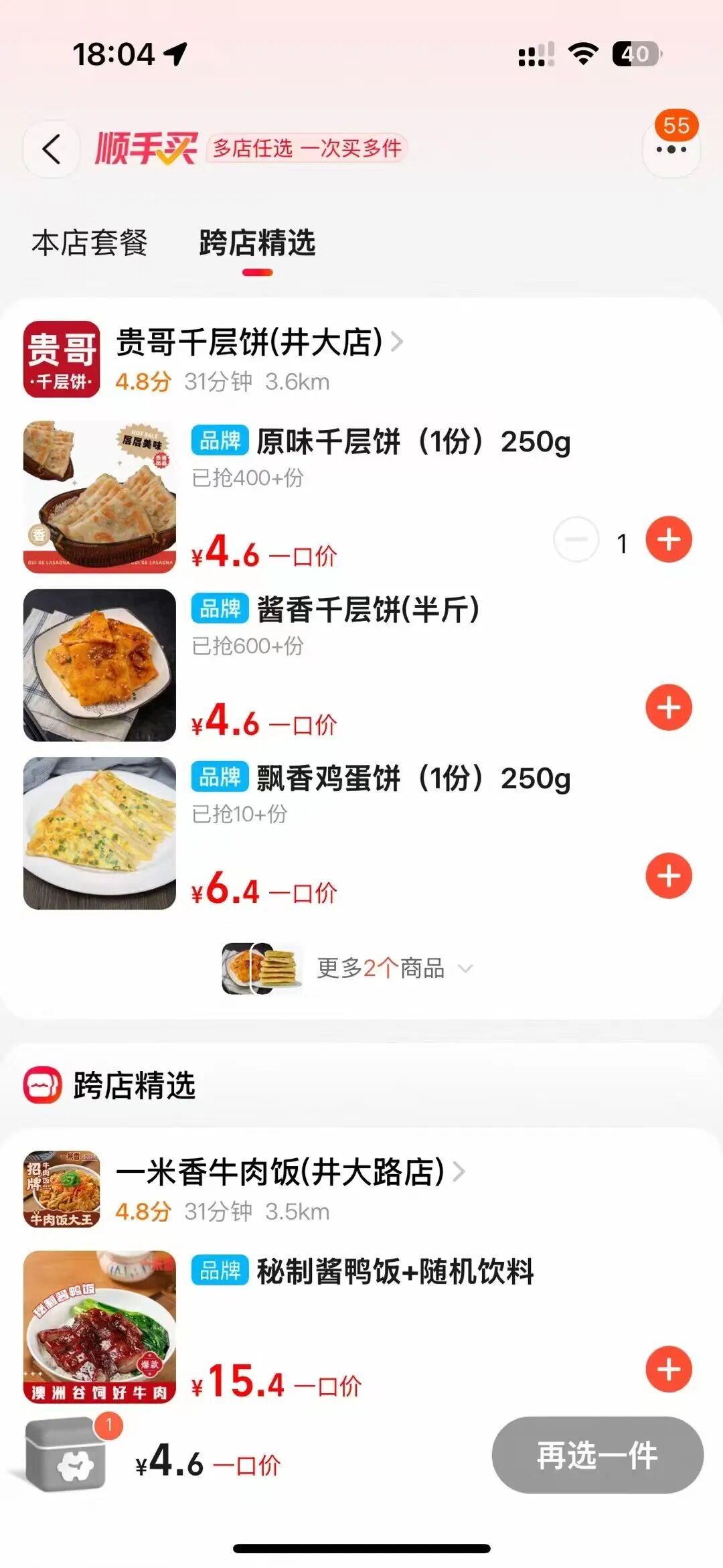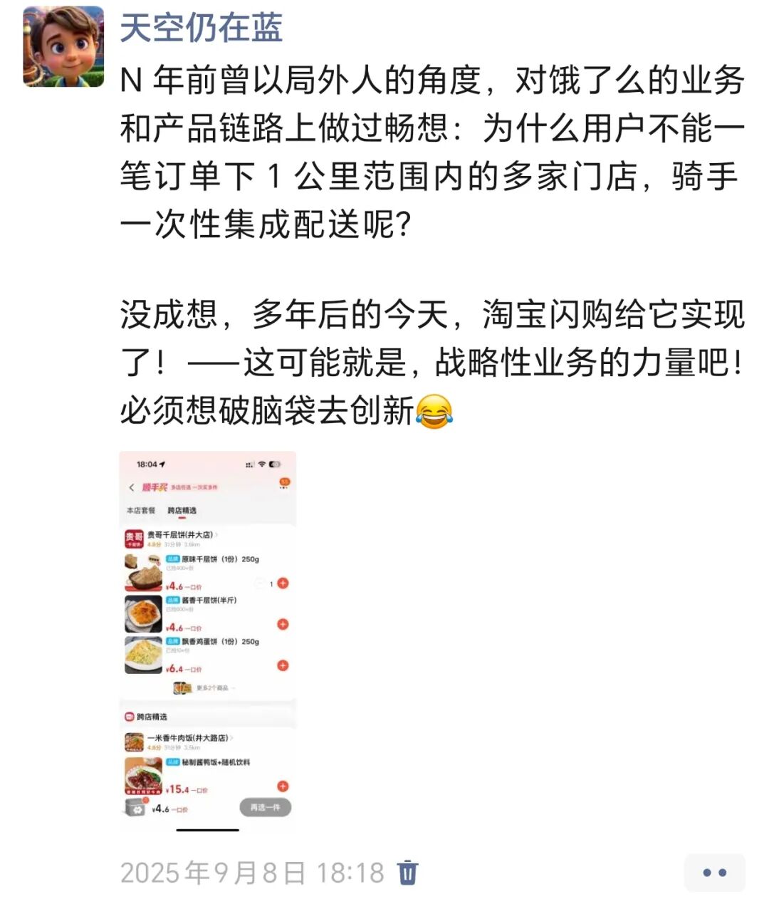 直到去年外卖大战,我再打开淘宝闪购,惊喜地看到了“跨店精选”“一次买多件”“再选一件”的功能!他们把当年那个朴素的想法,真正做成了现实。