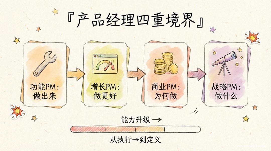 在深入讨论战略型产品经理之前,我们需要先理解产品经理能力模型的完整图景。根据业界共识和顶尖公司的实践,产品经理的成长通常会经历四个层次: